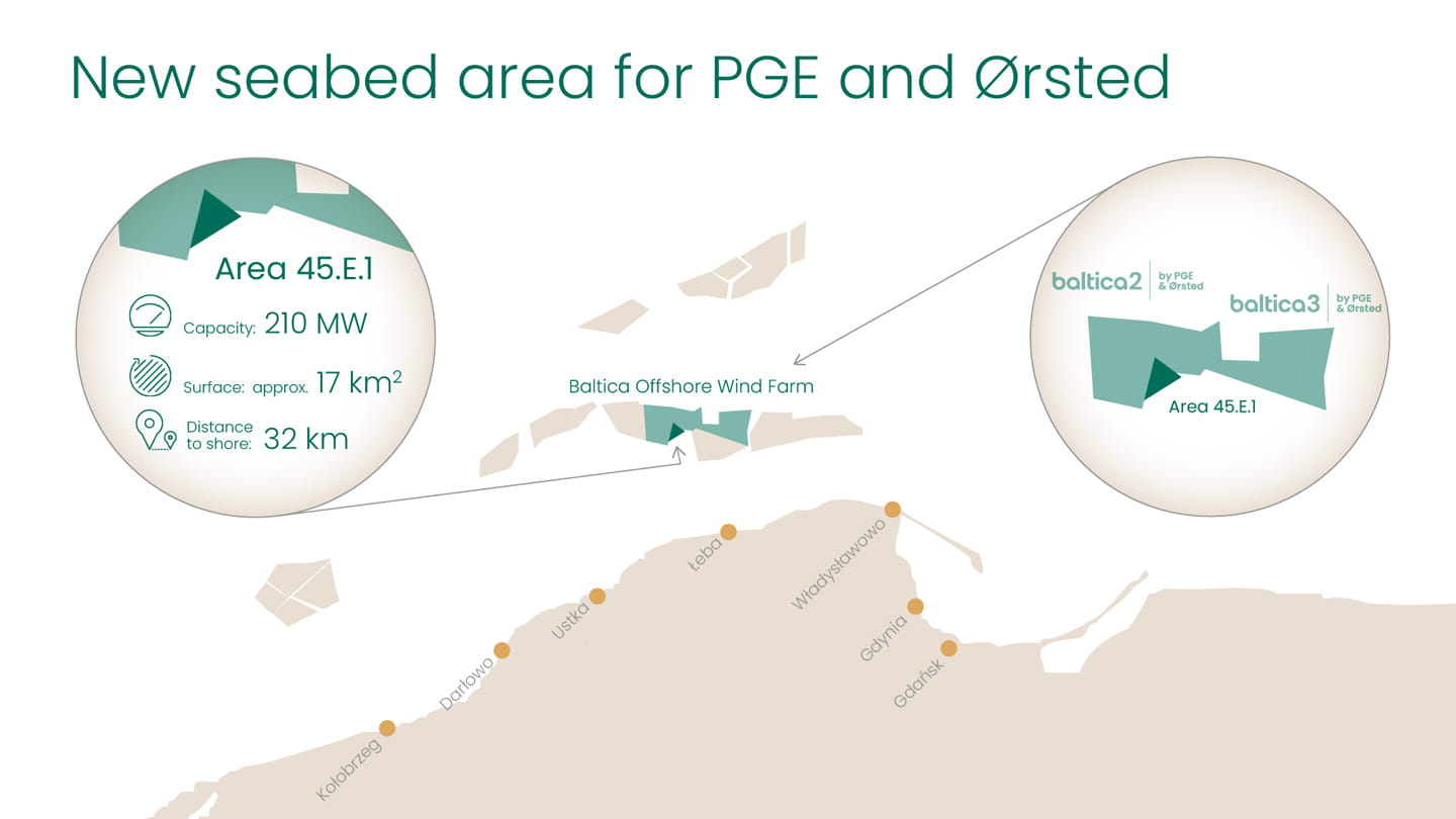 PGE and Ørsted plan to develop up to 210 MW of generation capacity in the 45.E.1. area. The project was tentatively named Baltica 2+. The seabed area is about 17 sq. km and is located about 32 km from the shore. The permit was applied for jointly by PGE and Ørsted which create a joint-venture.