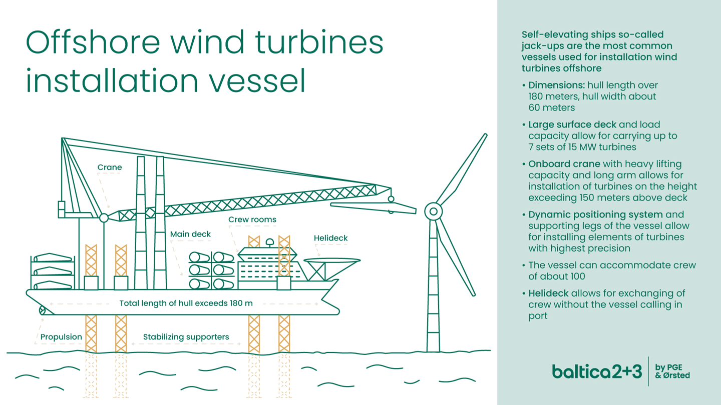 Installation of wind turbines for Baltica 2 has been divided into two stages, and a contractor for each stage is selected in separate tender procedure. The first batch of turbines that PGE and Ørsted contracted in April 2023 will be installed by Fred. Olsen Windcarrier.