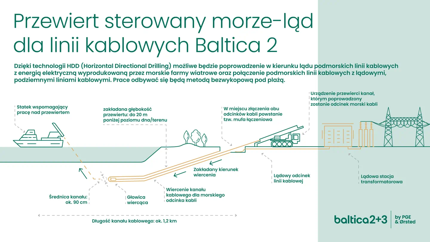 Podmorskie linie kablowe mają za zadanie przesył energii elektrycznej wyprodukowanej przez morskie farmy wiatrowe na ląd, do infrastruktury przyłączeniowej. Morski odcinek linii kablowych łączy się z odcinkiem lądowym na lądzie. Przekroczenie linii brzegowej, dzięki któremu możliwe będzie połączenie morskiego odcinka kabli z odcinkiem lądowym, zostanie wykonane bezwykopową technologią horyzontalnego przewiertu kierunkowego (HDD - Horizontal Directional Drilling). To najmniej inwazyjny sposób pozwalający na instalację linii kablowych. Nie wymaga – jak w przypadku tradycyjnego wykopu otwartego – zamknięcia części plaży na czas prac budowlanych. Jest to metoda bezpieczna, prowadzona na znacznej głębokości (ok. 20-30 m pod ziemią) i pozwala na zachowanie turystycznych i przyrodniczych walorów terenu, na którym będą wykonywane prace.